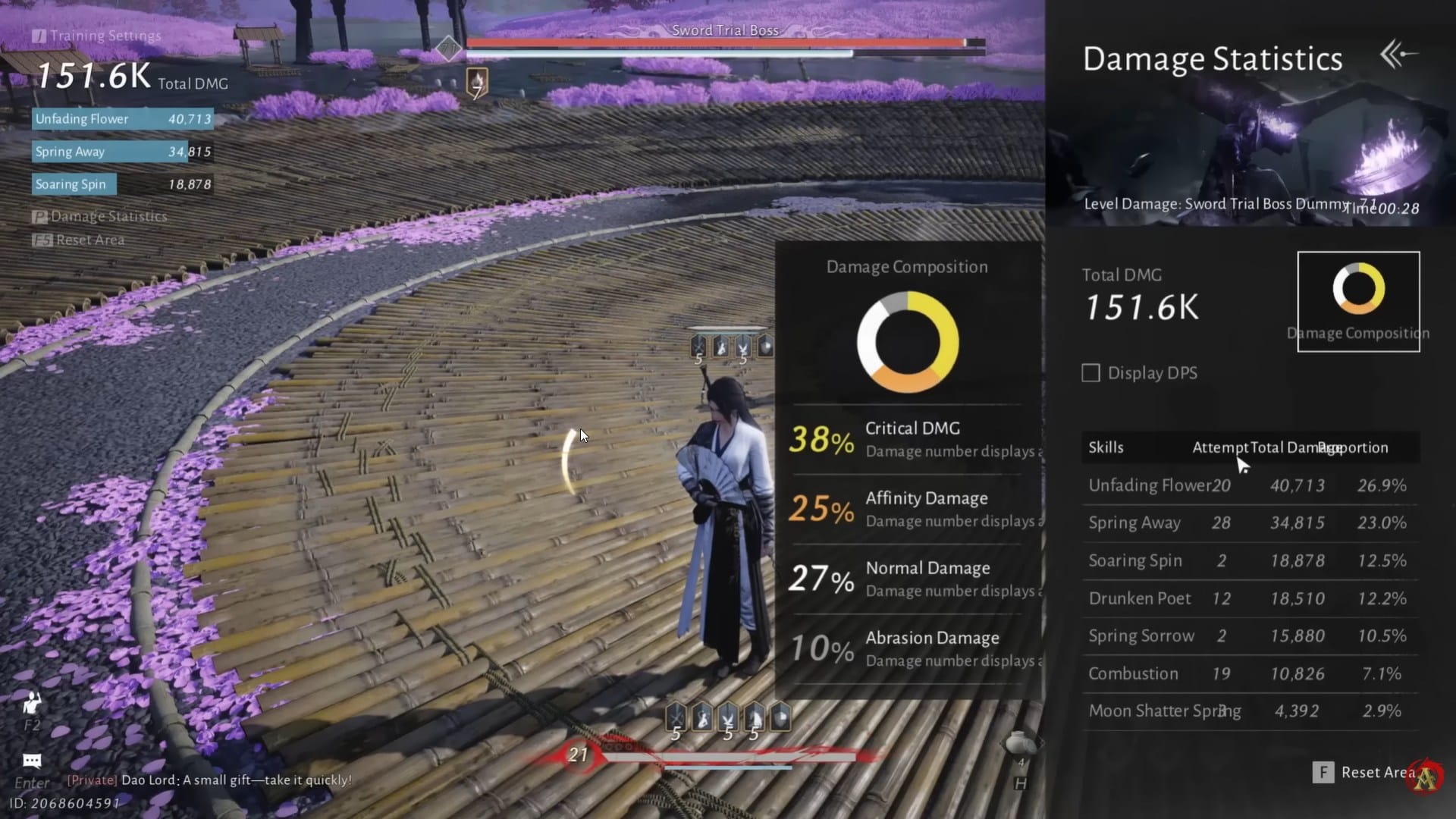 After the session, review the detailed damage report. You can see exactly how much damage each skill, passive, and effect contributed.
