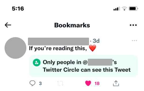 You’ll now see the Circle Tweet you bookmarked earlier appear inside the Bookmarks screen.