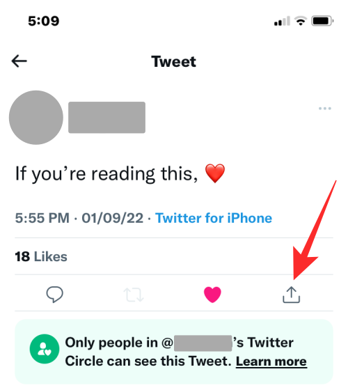 To bookmark a Circle tweet, open a tweet marked with a Twitter Circle logo from your timeline or someone’s Twitter profile. When the tweet opens, tap on the Share icon underneath this tweet.