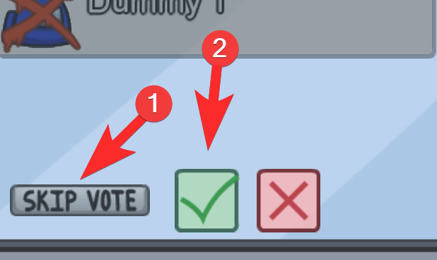 Locate the Skip Vote button on the bottom left side of the voting screen beneath the names of all the crewmates. When you tap/click on it, a green box with a checkmark and a red one with a cross will appear next to the button. Select the green box to skip.