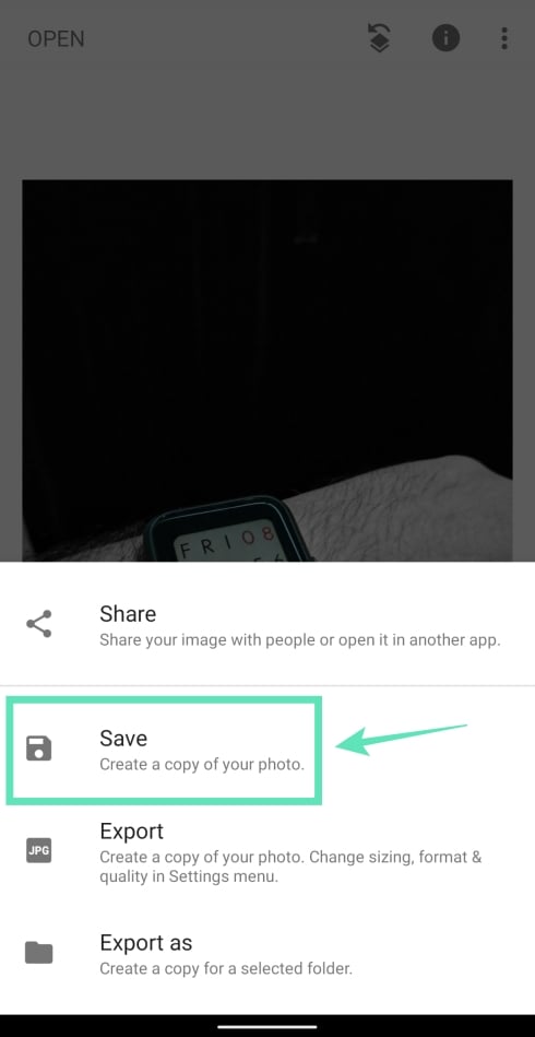 Step 9: To save the edited picture, tap on the Export tab at the bottom and select Save.