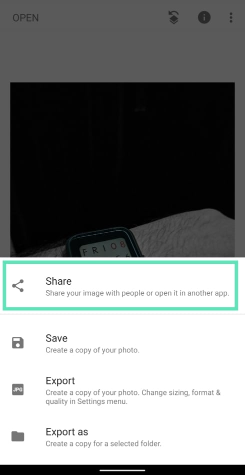 Your photo will now be saved to your library. You can also share this picture directly from Snapseed by tapping on Share.