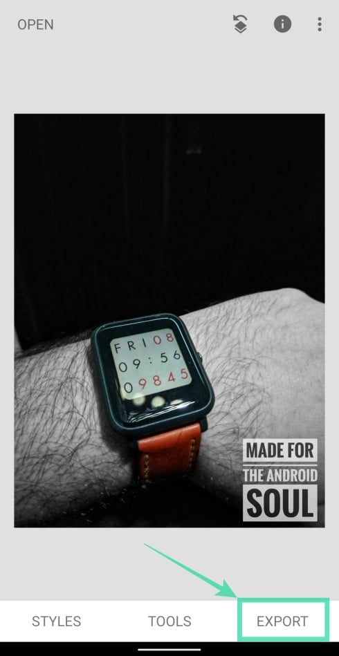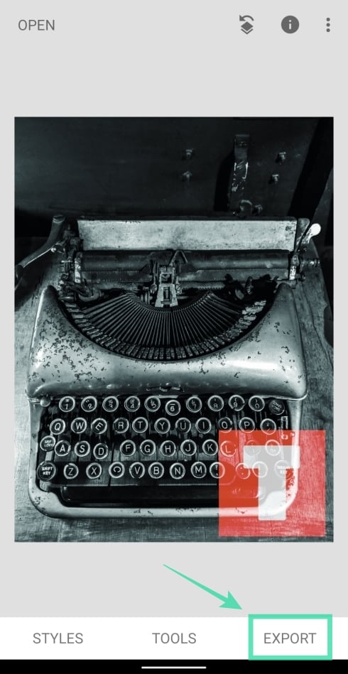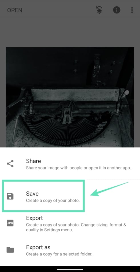 Step 13: To save the edited picture, tap on the Export tab at the bottom and select Save. You can also share this picture directly from Snapseed by tapping on Share and then select an app or contact to share to, from the Share menu.