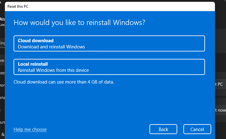 4. The next screen should ask you how you would like to reinstall Windows. If your PC has an internet connection, you can proceed with the ‘Cloud download’ option, else proceed with ‘Local reinstall’.