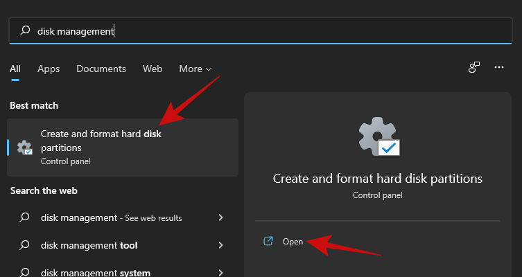 1. Open the Start menu and type in ‘Disk Management’. Click on the search result or the open button.
