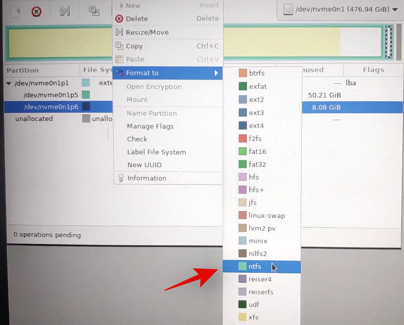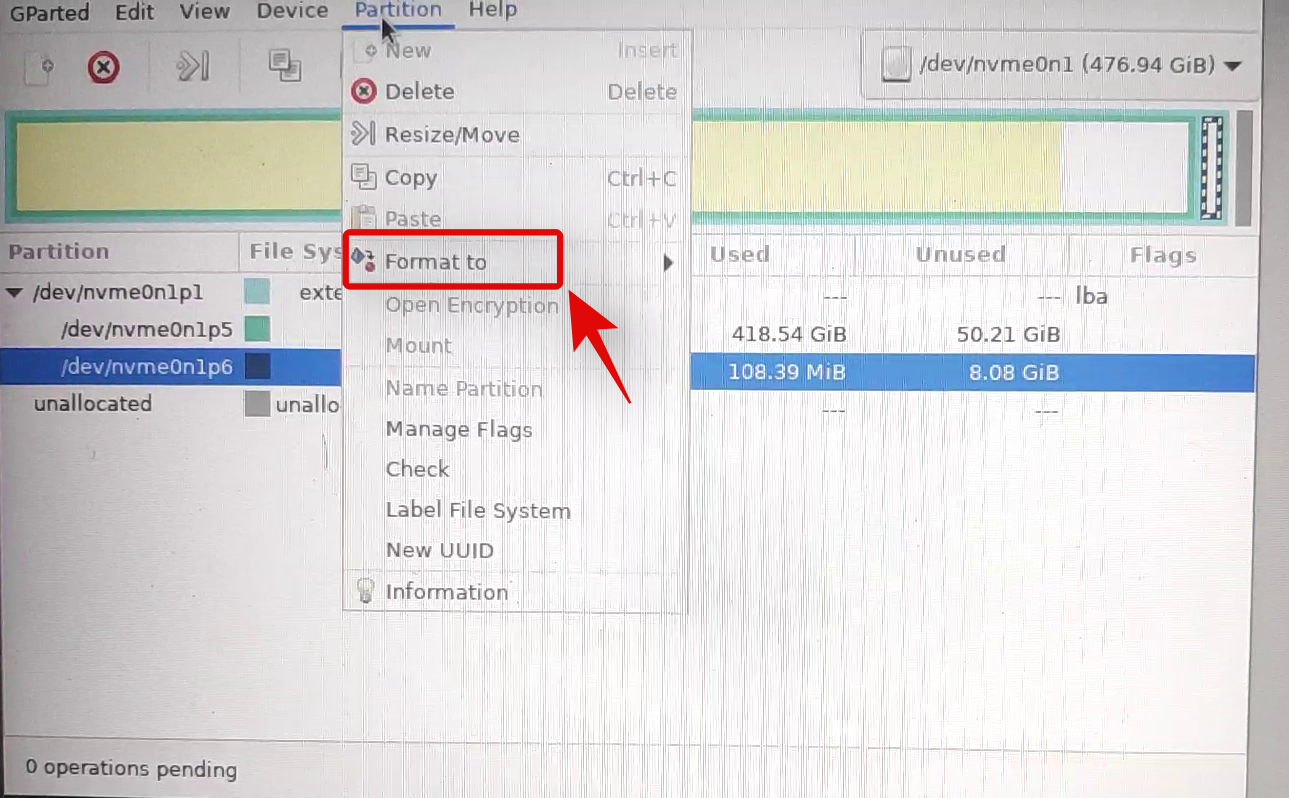 7. Now click on ‘Partition’ at the top and hover over ‘Format to’.
