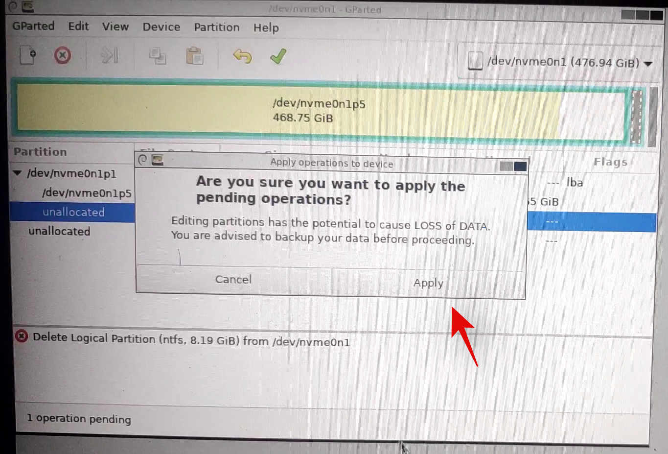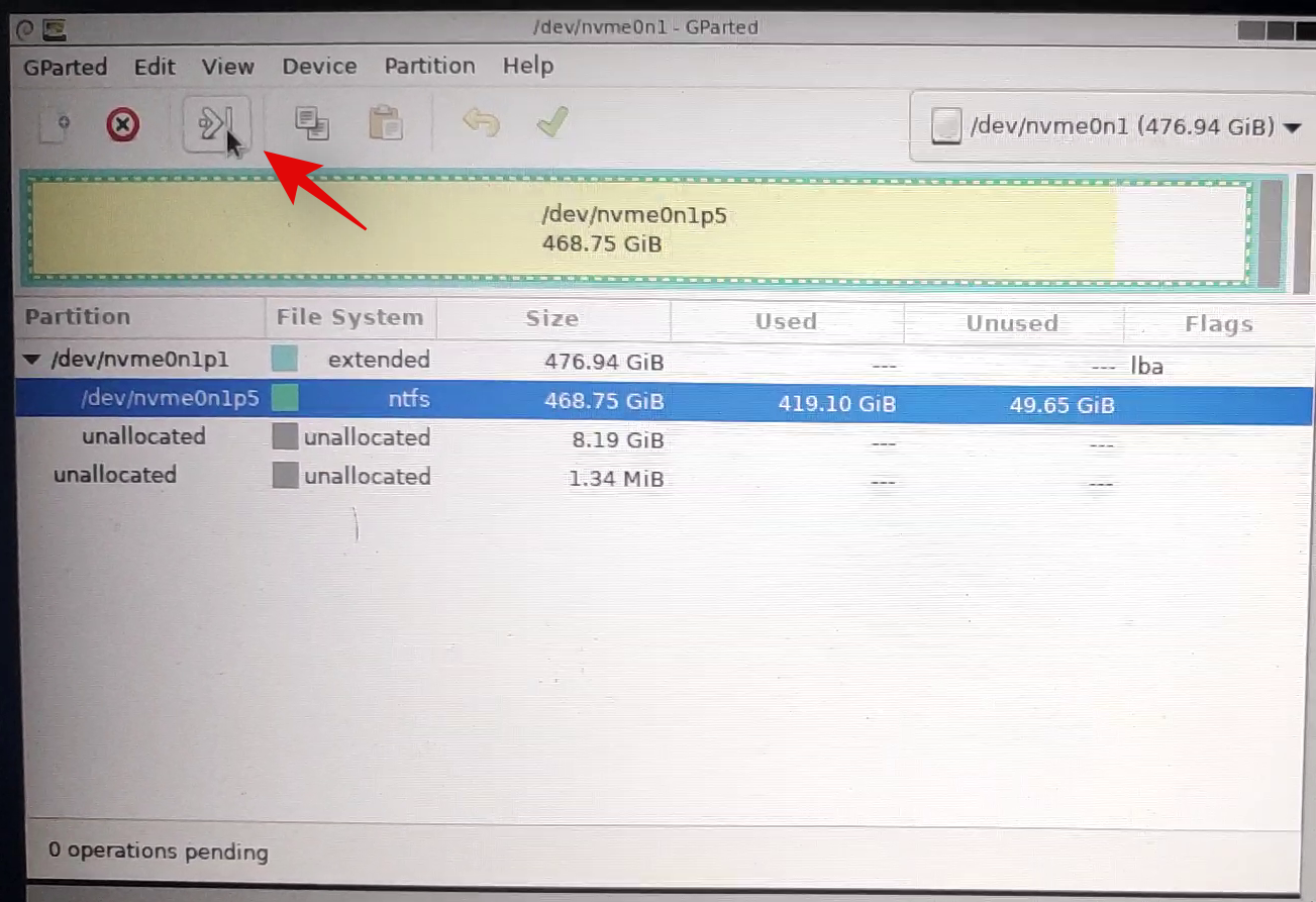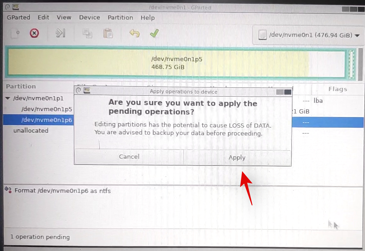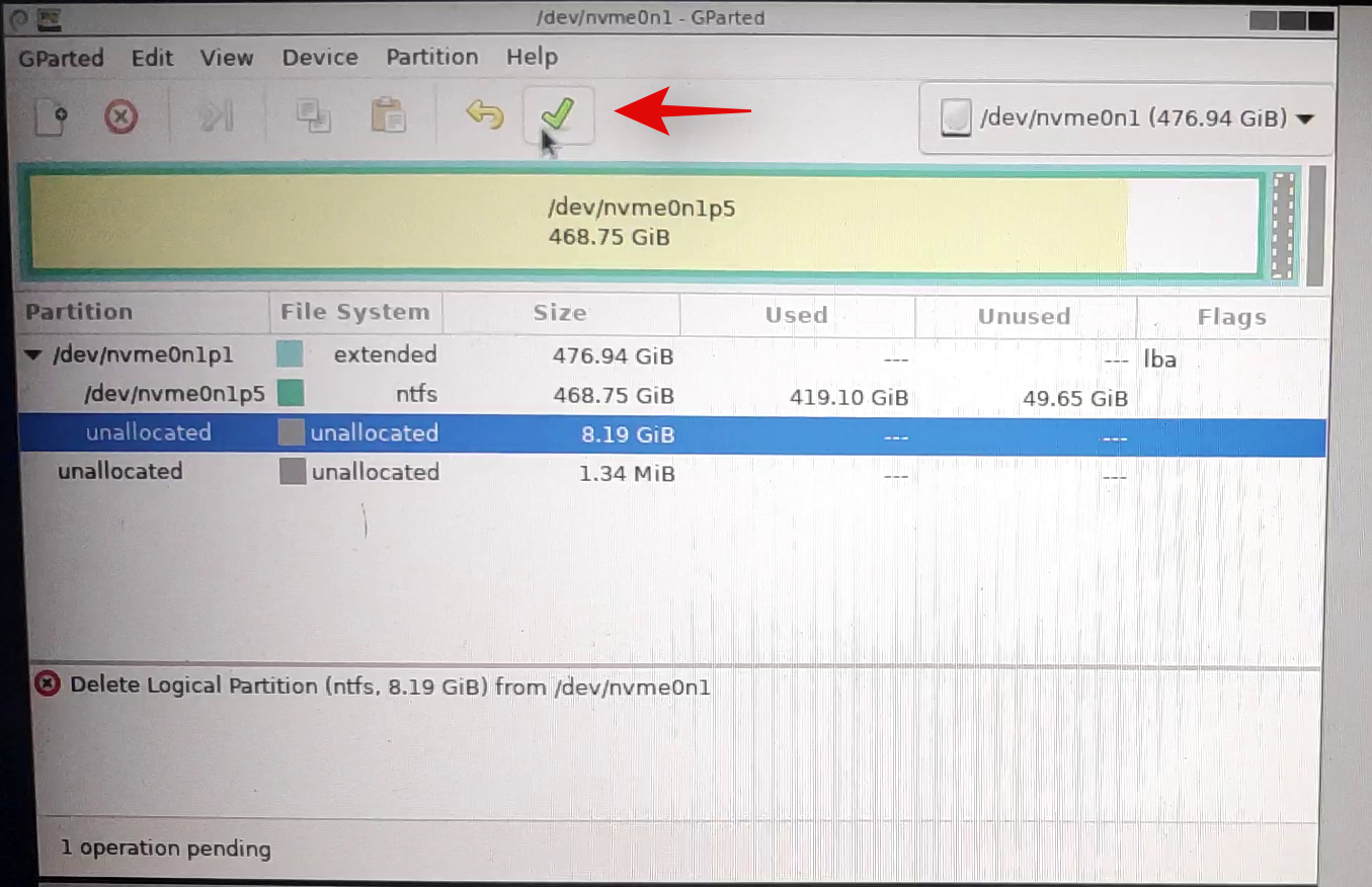 9. Once you select the desired disk format, GParted will cue the current operation in its task list. Click on the checkmark in the toolbar at the task to execute cued tasks.