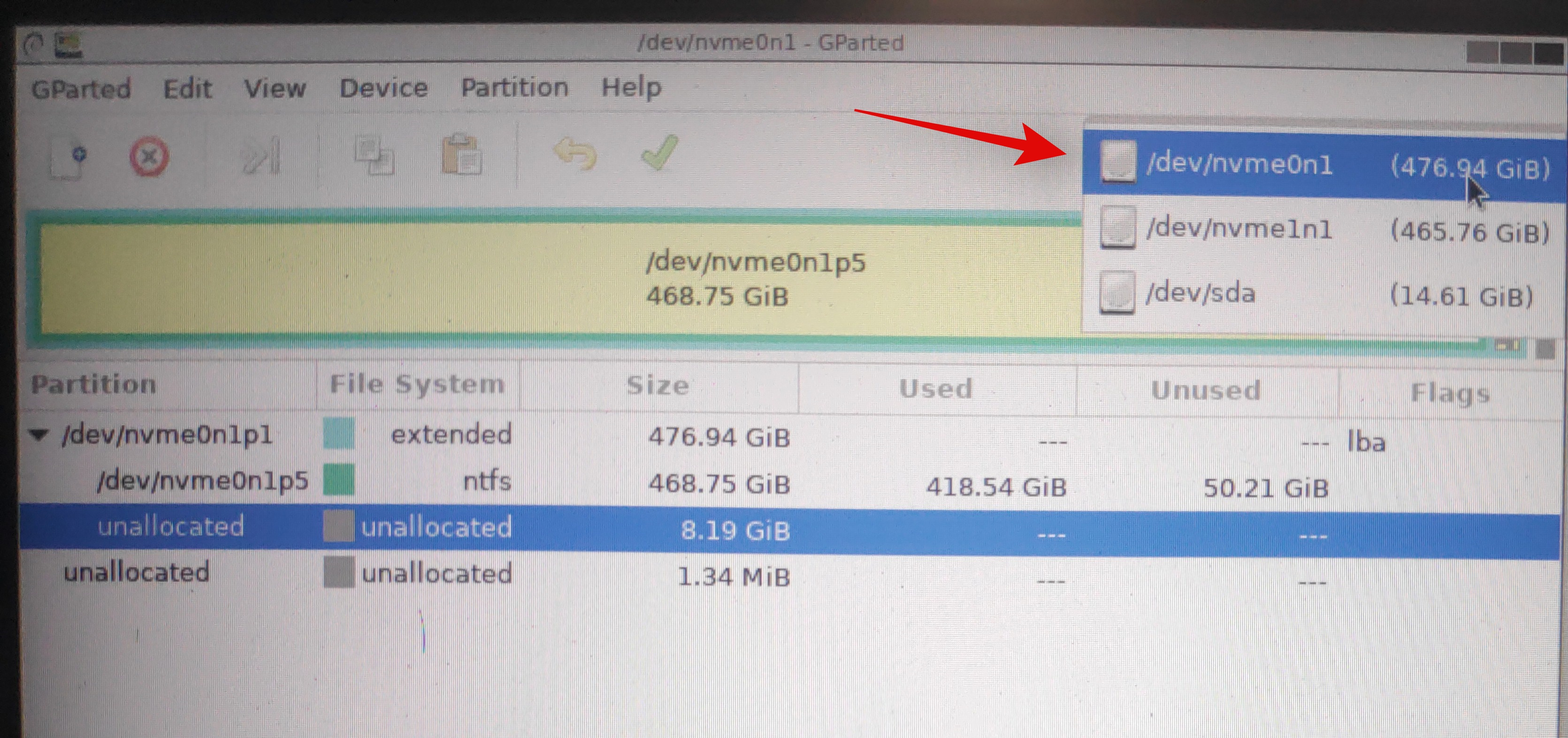 5. GParted will now be booted and you will be taken to its temporary desktop. The partition manager should automatically launch on your system now. Click on the drop-down menu in the top left and select the desired disk that you wish to format.