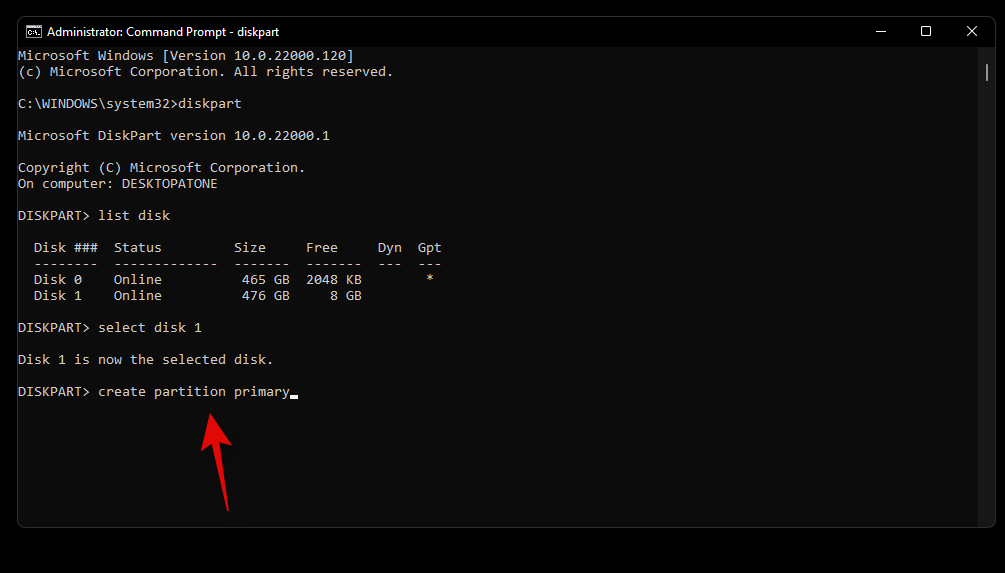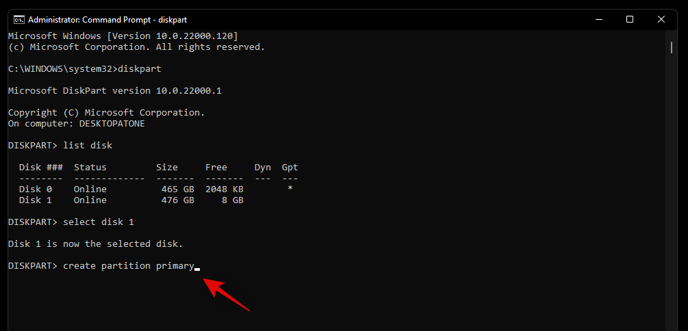 5. We will now need to create a partition on the selected disk so that it is usable. Enter the command below to get started:create partition primary