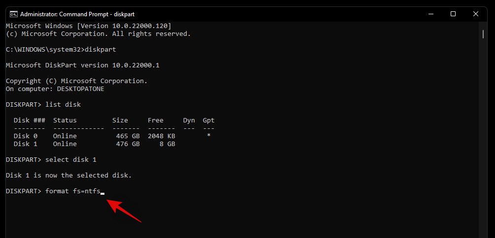 6. Use the command below to format the newly created volume now. format fs=ntfs