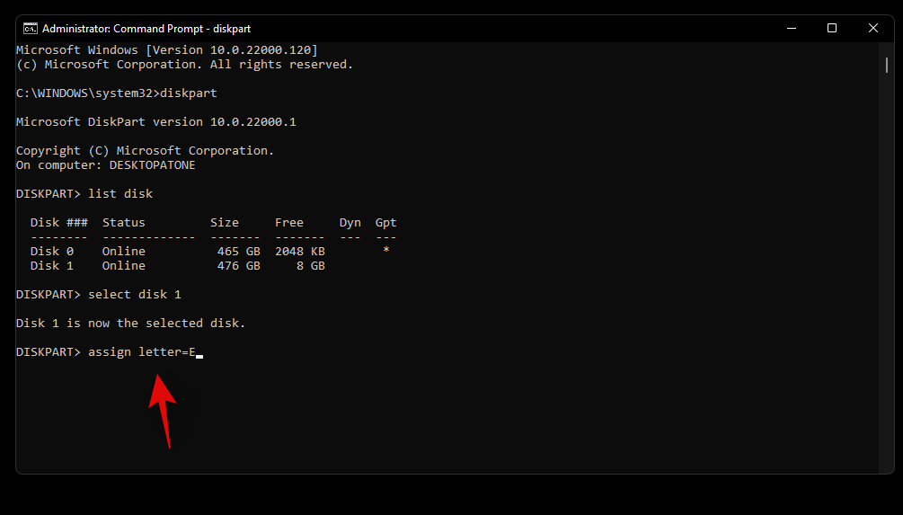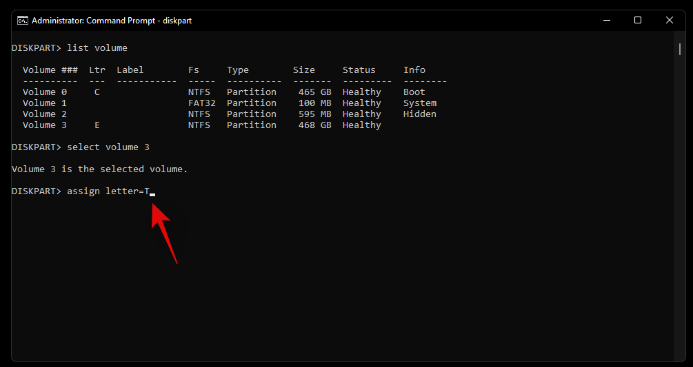 7. Now use the command below to assign a letter to the drive. Replace X with the drive letter of your choice. assign letter=X
