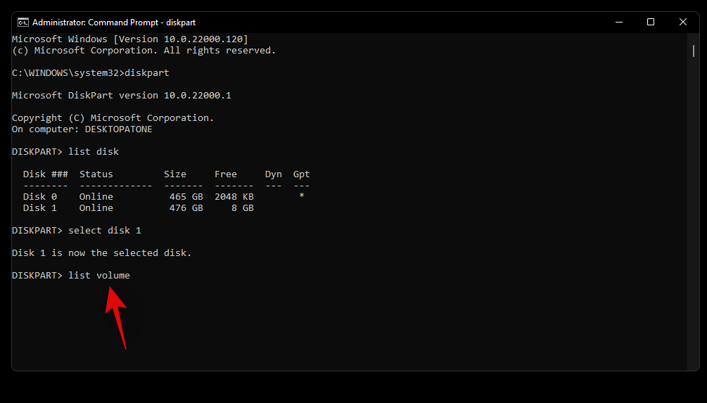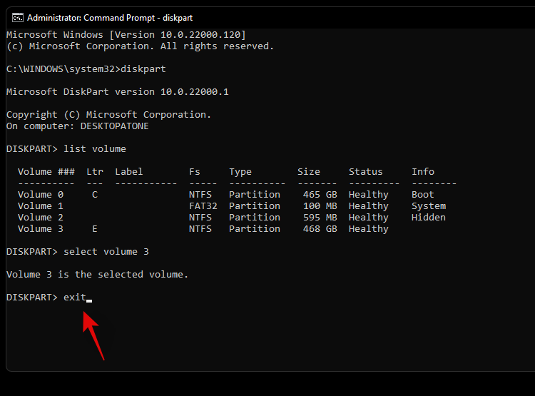 6. Enter the following command and replace N with the volume number you noted down earlier. select volume N