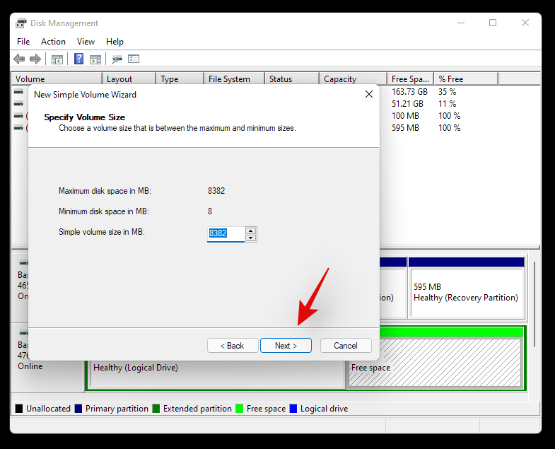 4. Select a custom size if needed. By default, Windows will use the entire unallocated space to create a new simple volume on your drive. Click on ‘Next’ once you have set the desired size.