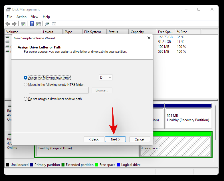 5. Choose a drive letter for your new volume now. Click on ‘Next’ once you are done.