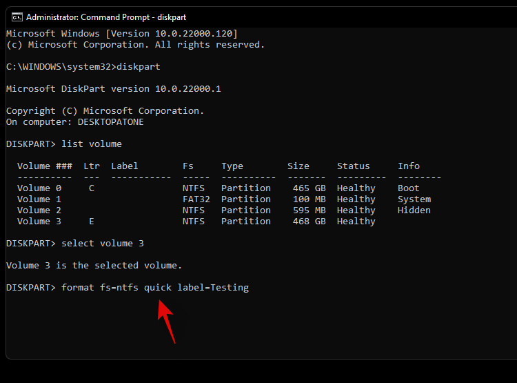 8. Now use the following command to format the selected volume with NTFS as its format. Replace NAME with the name you wish to give your newly formatted volume:format fs=ntfs quick label=NAME
