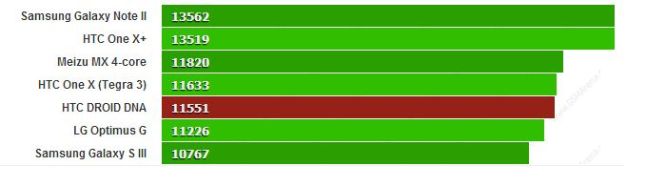 AnTuTu is another overall performance power benchmark, and the Droid DNA didn’t fare as well as the others, though it did beat the LG Optimus G.
