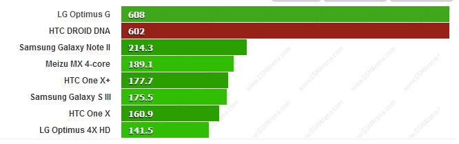 GL Benchmark gives us an indicator towards how good the graphics processing capability of a device is, and as you can see above, the Droid DNA towers above the rest, with the Optimus G comig a close second. Incidentally, the Droid DNA has got the highest score of any smartphone tested by GSM Arena so far, and that says a lot about what the Adreno 320 GPU that this fella packs, can do.