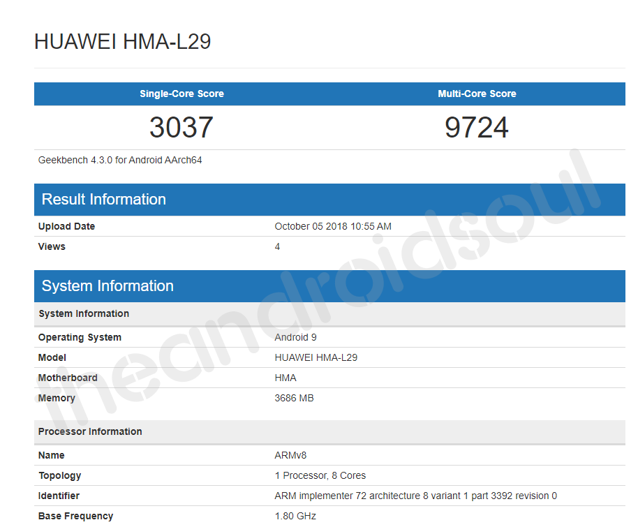 As you can see in the image above, the Mate 20 is scoring 3037 points in single-core performance of the version 4 of Geekbench benchmark, while under the multi-core performance test, it scores 9724 points.
