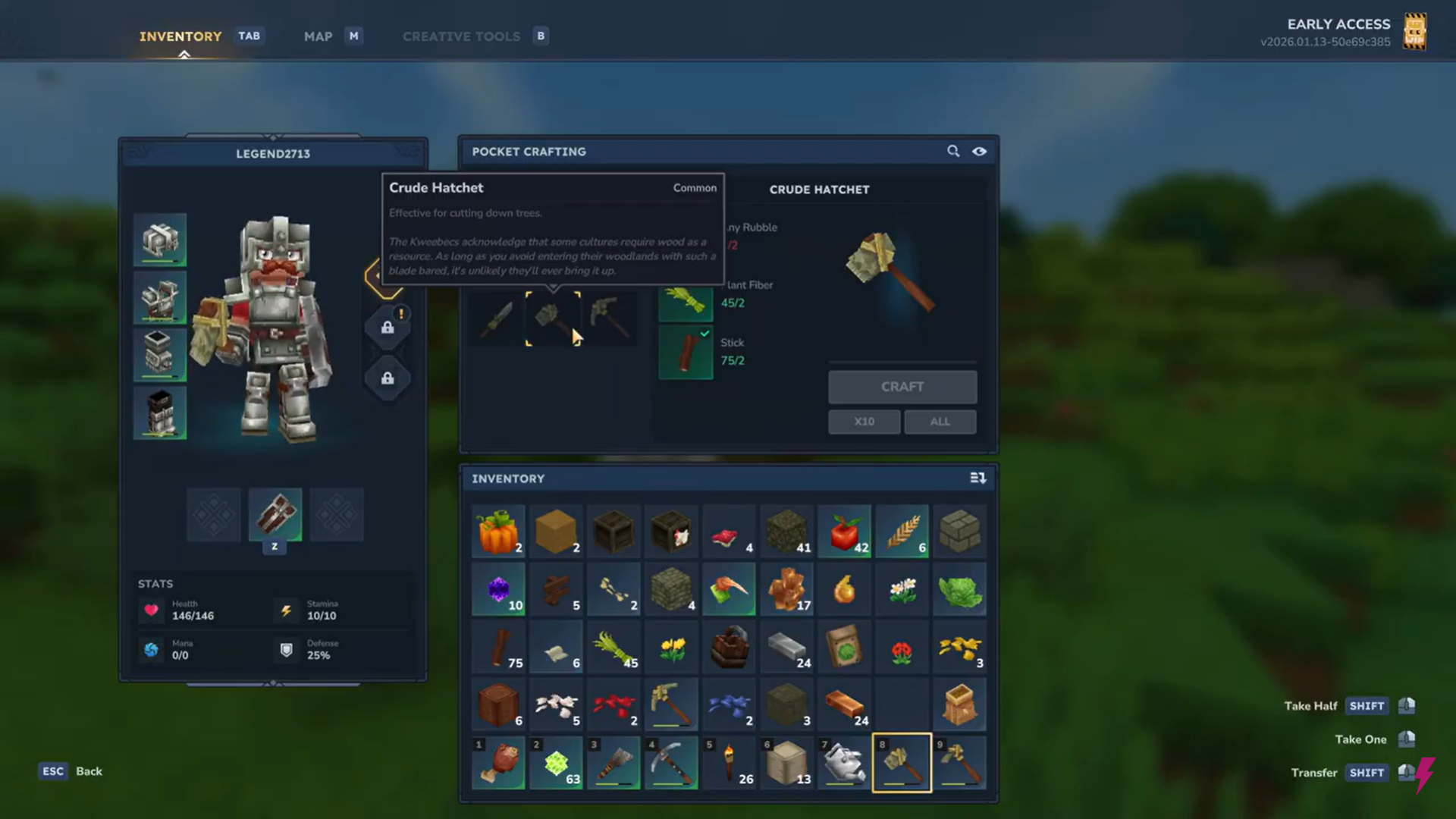 Open pocket crafting by pressing the Tab key. Craft a crude hatchet using: