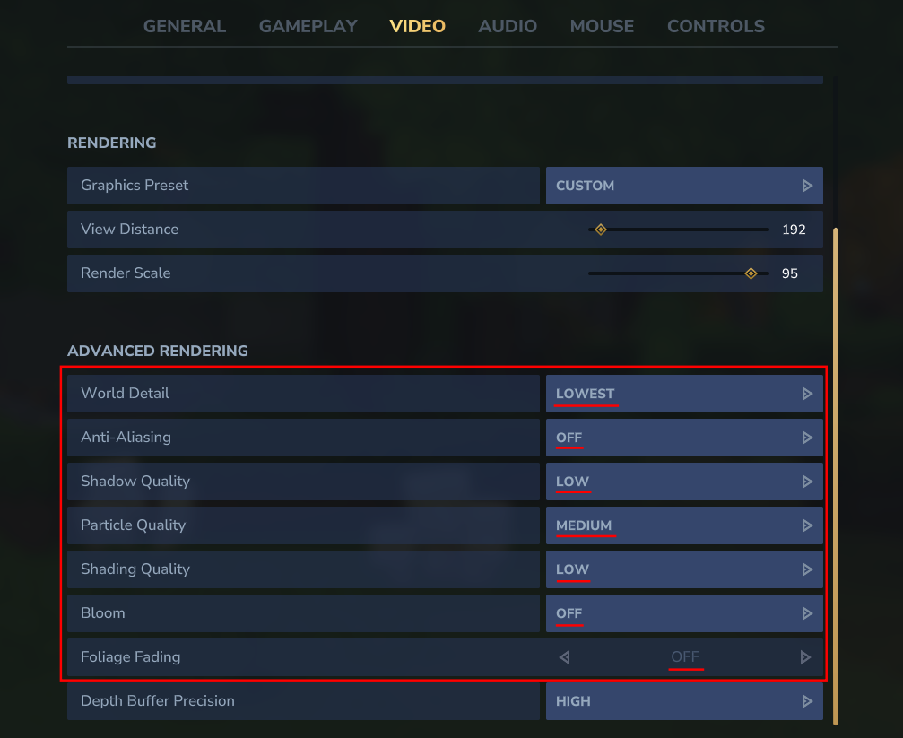 In Advanced Rendering, set World’s Detail to Lowest, Anti-Aliasing off, Shadows Low, Particles Medium/Low, Shading Low, Bloom Off, Foliage Fading Off.