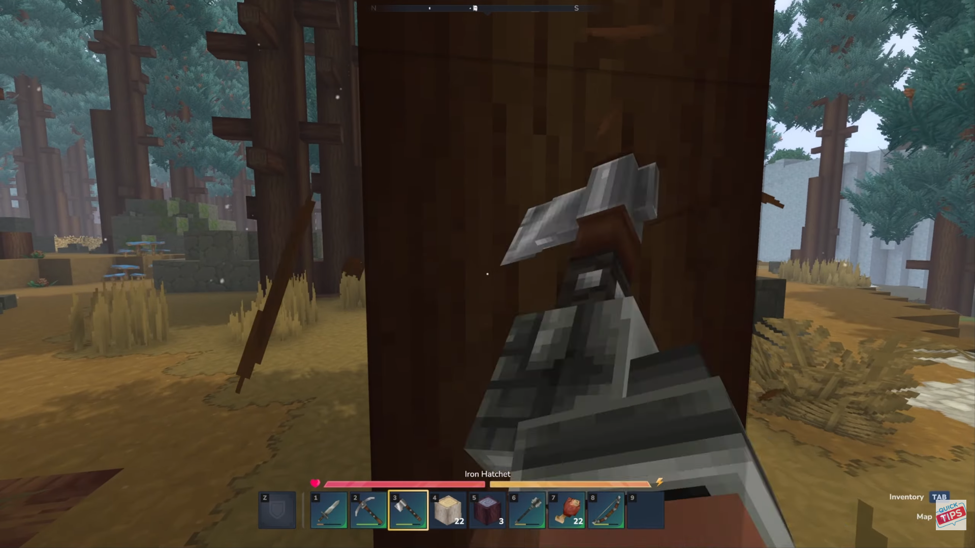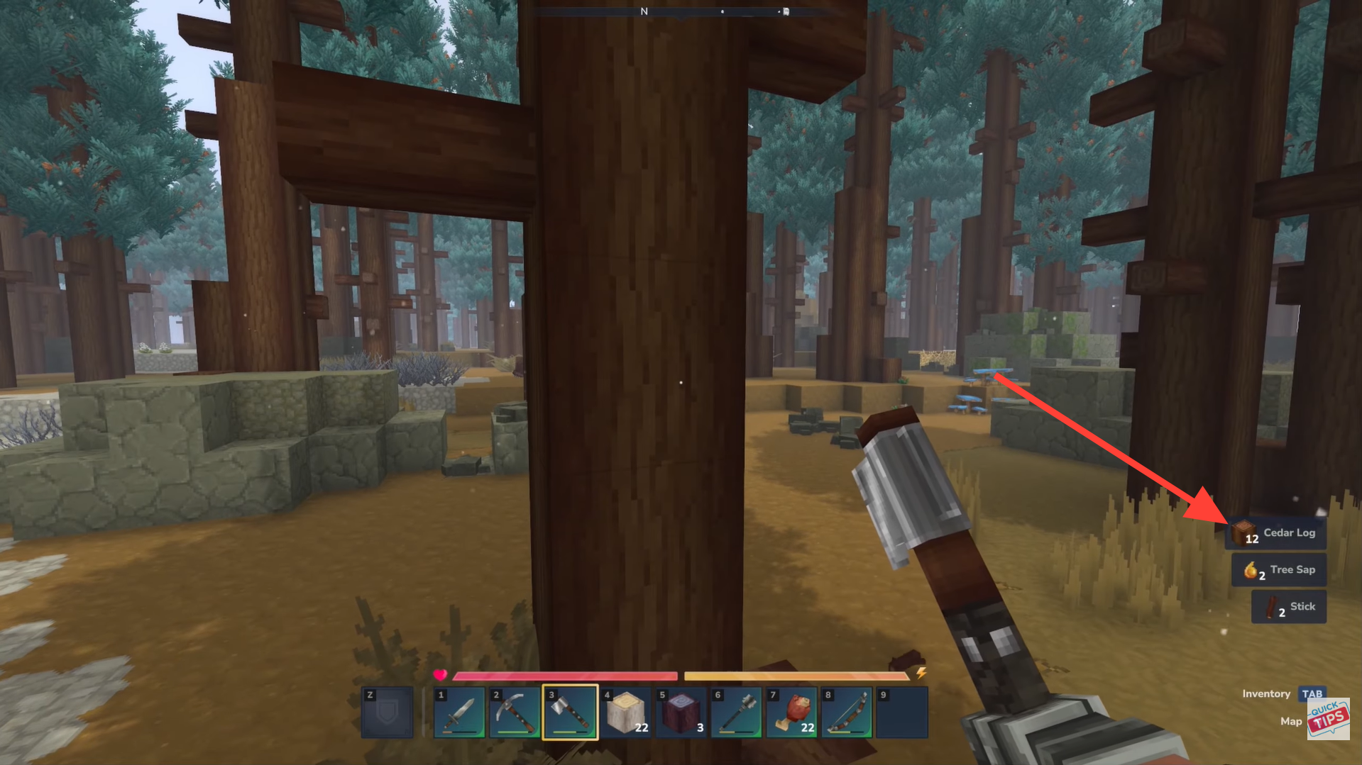 Walk over the dropped cedar logs to pick them up; they’ll go straight into your inventory.
