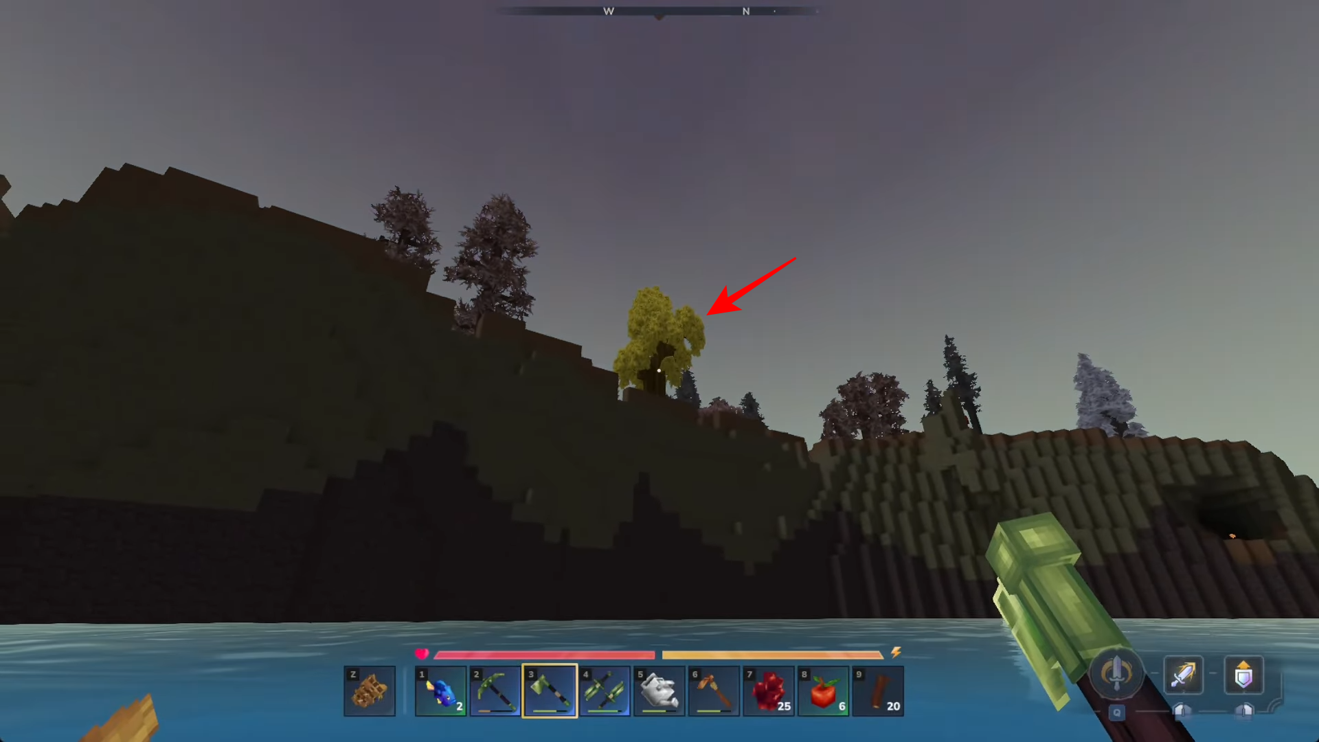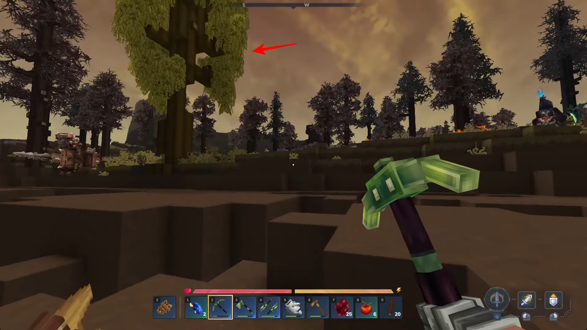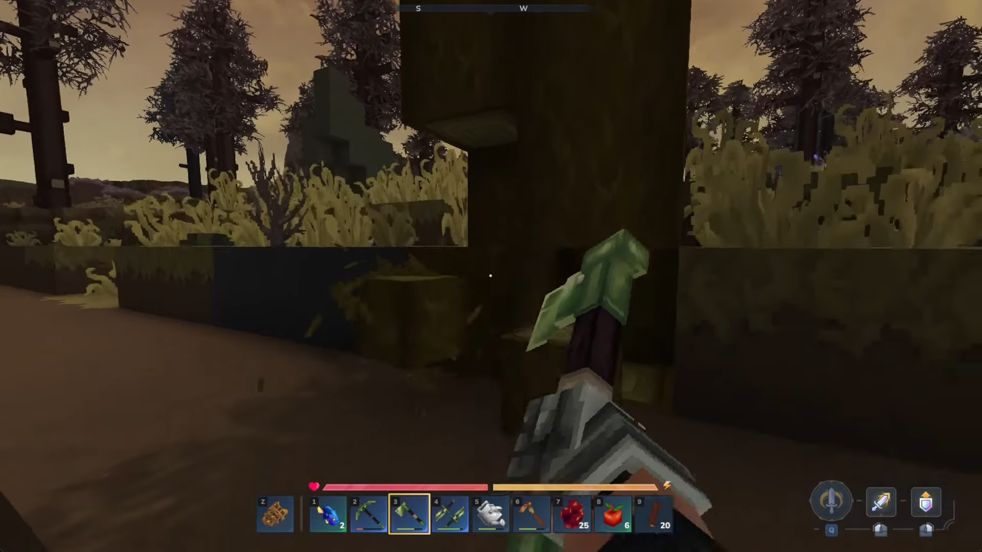 The “Goldenwood Trunks” required for upgrades are actually obtained by chopping down Sallow trees. These trees have a distinct coloring and look like this…
