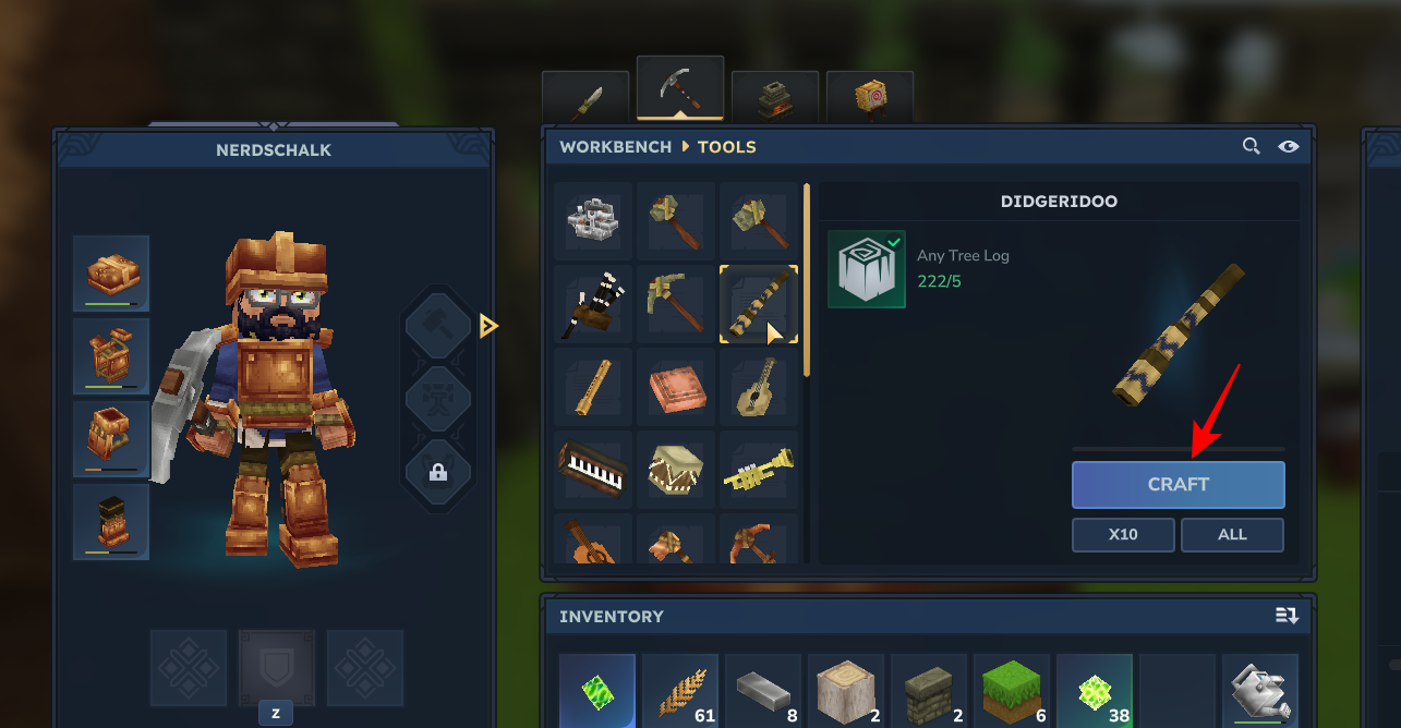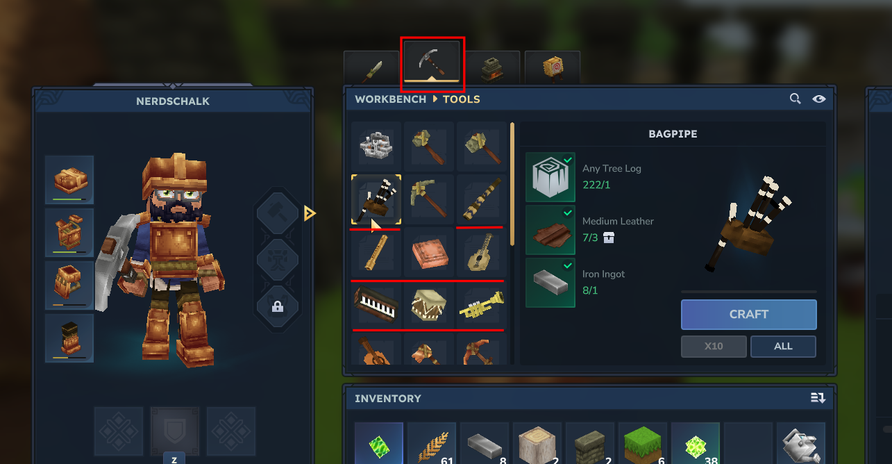 Go to the Tools section. Here, you’ll see a bunch of instruments available for you to craft.