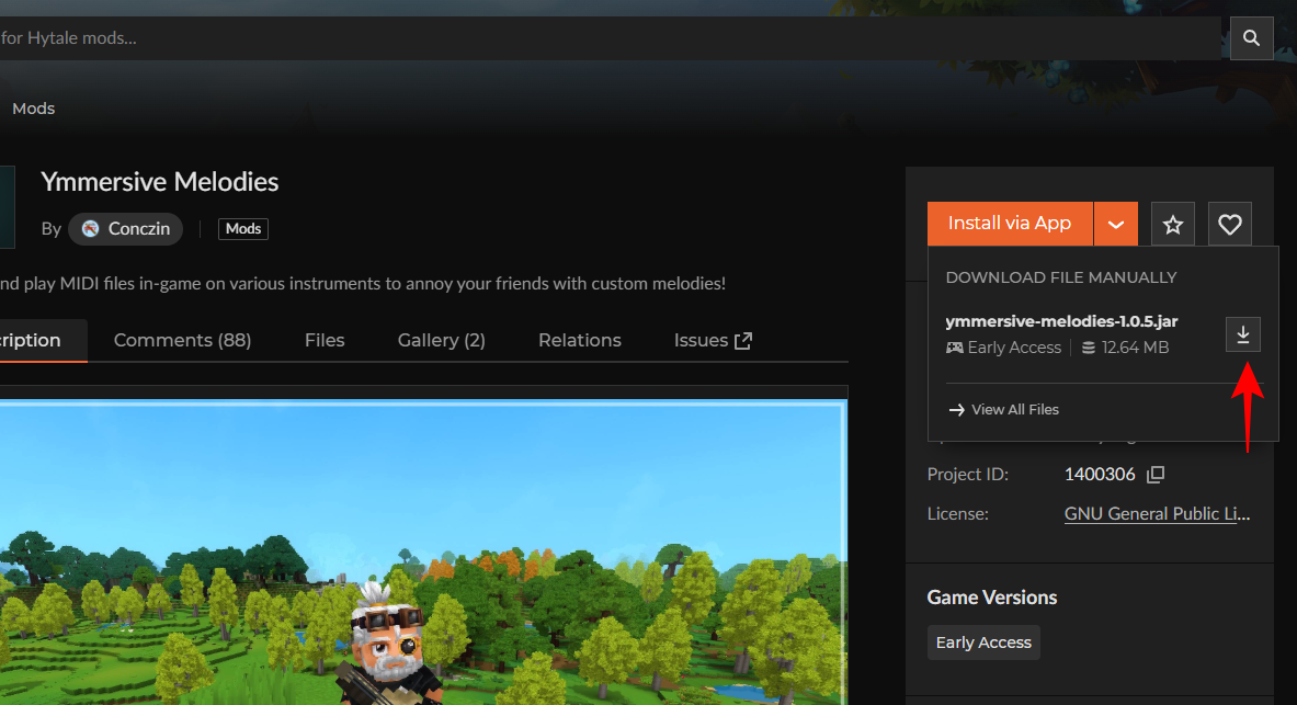 Alternatively, you can install the CurseForge app, open the Hytale section to browse Ymmersive Melodies, and install it directly.