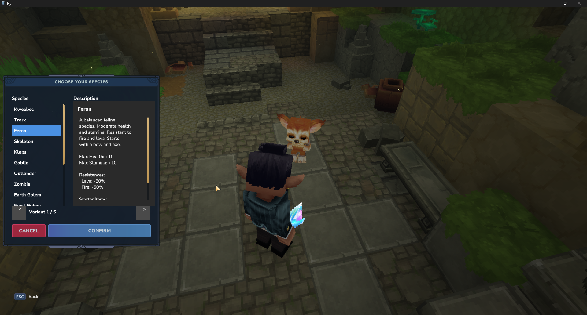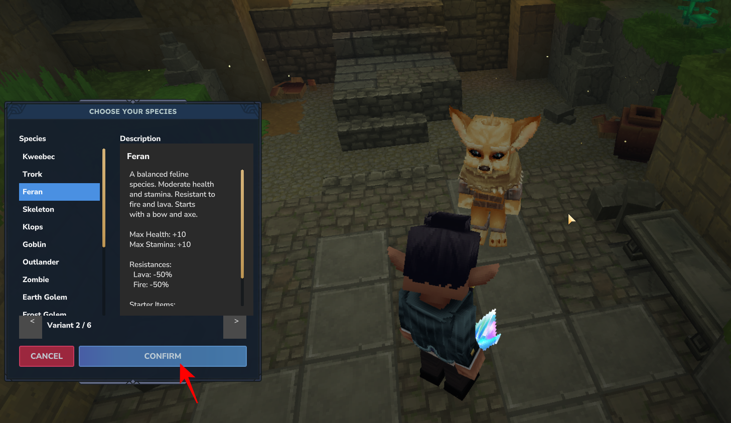 Each species has unique stats and advantages as well as starter items. Click Confirm once you find the species you want to start with.