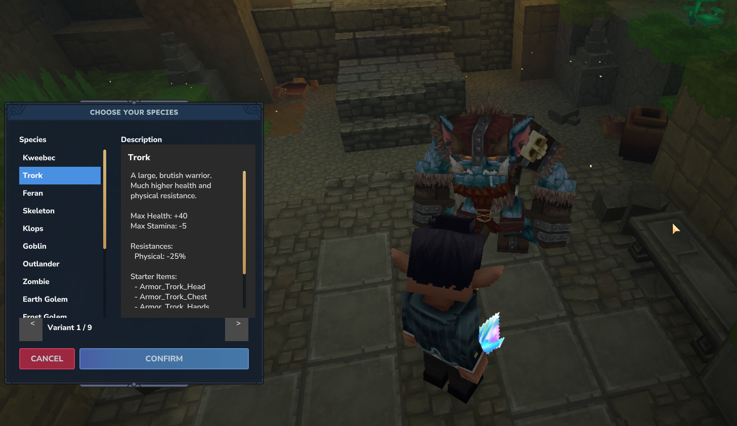 Each species has unique stats and advantages as well as starter items. Click Confirm once you find the species you want to start with.