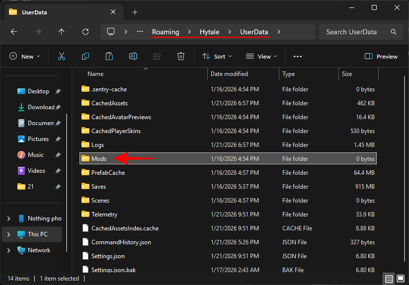Navigate to the UserData/Mods folder.