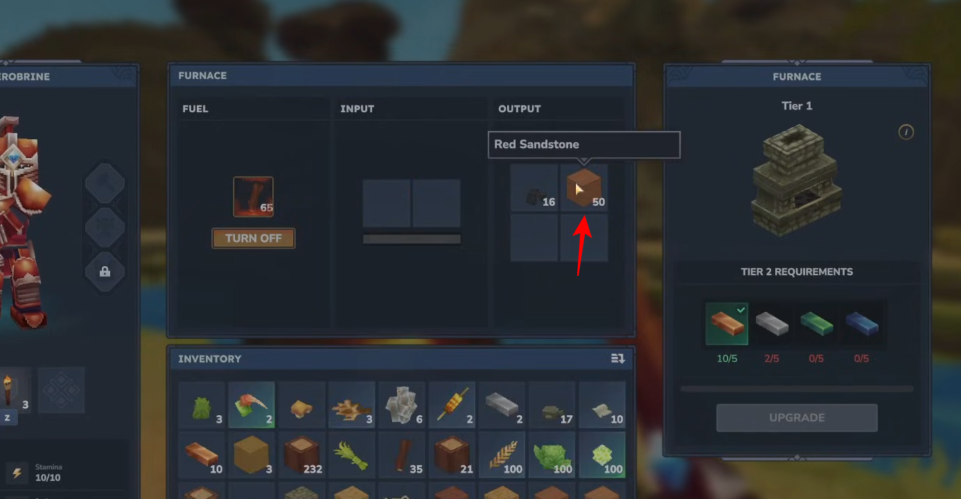 Activate the furnace; every 2 Red Sandstone Cobble yields 1 Red Sandstone—collect from Output once done.