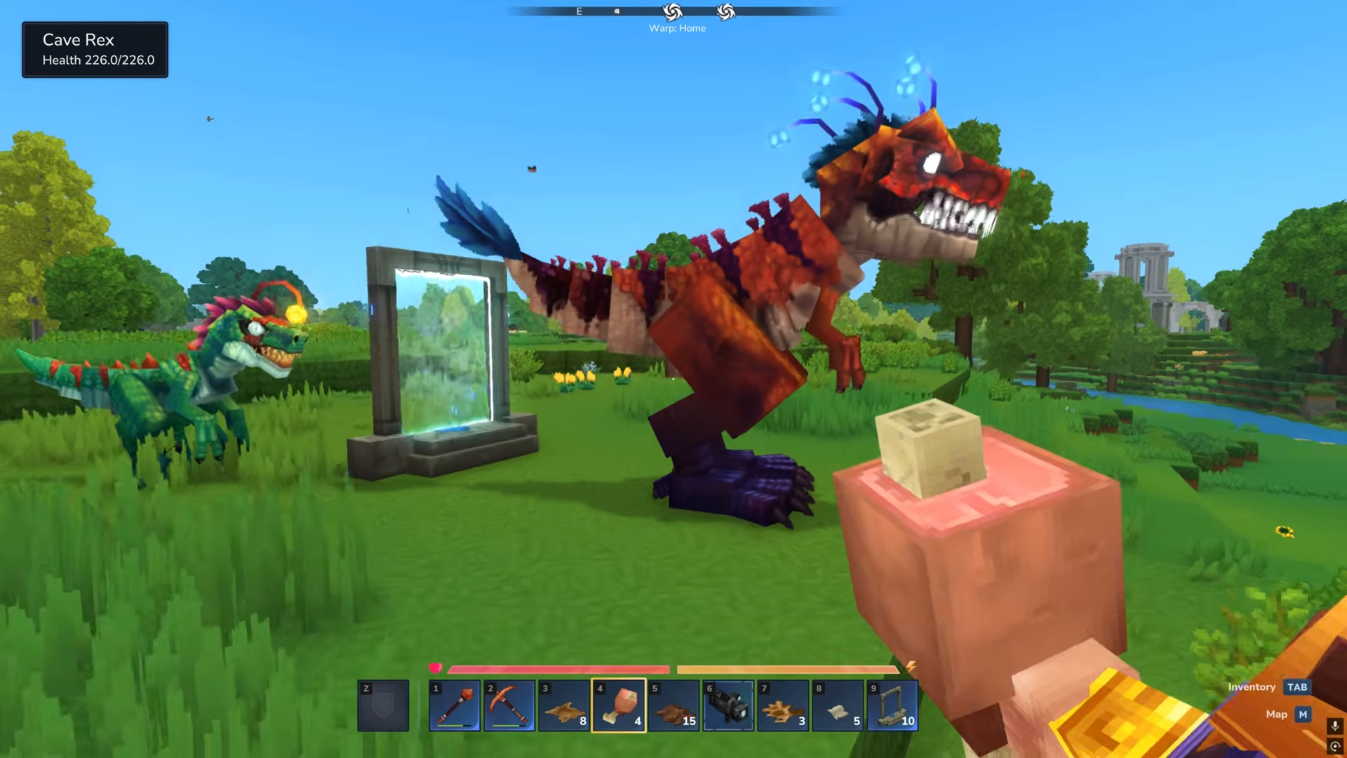 Trigger the portal while mounted or leading; dash through quickly—the dino follows and “tames” temporarily on the other side.