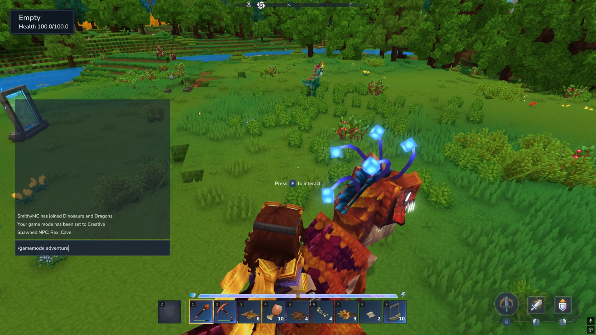 Walk up to your secured dino and press F to mount—works on land or near water.
