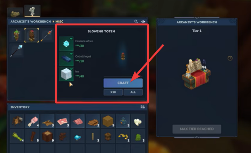 Place the Arcanist’s Workbench and open its crafting interface to access utility and totem recipes. Once unlocked, the Slowing Totem appears in the utility or miscellaneous section.