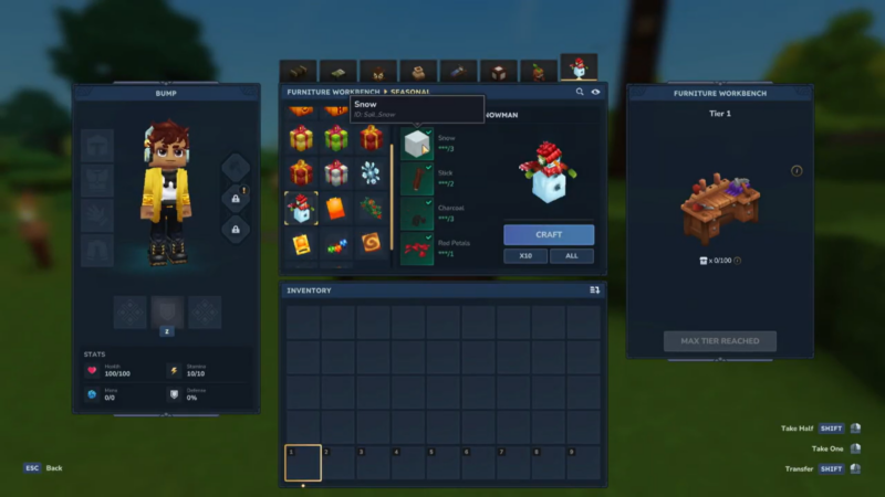 The Snowman is categorized under furniture rather than survival tools, which means you will not craft it from your basic inventory menu. You must first unlock and place a Furniture Workbench in your world.