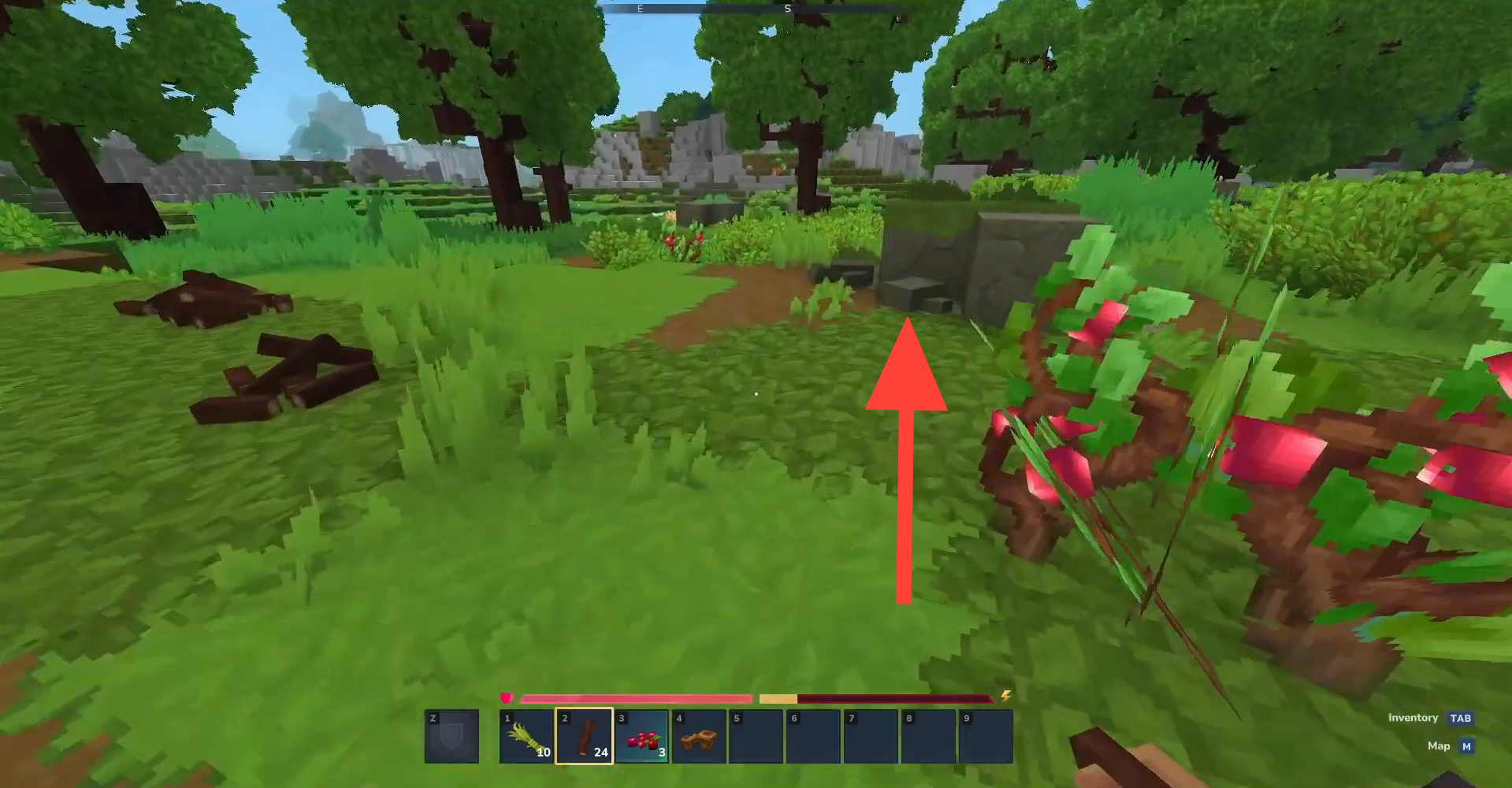 Walk through forests, hills, or rocky areas and scan the ground for small, dark grey stones. These are stone rubble items that you can pick up directly. They’re often clustered near stone walls, cliffs, or riverbanks.​​