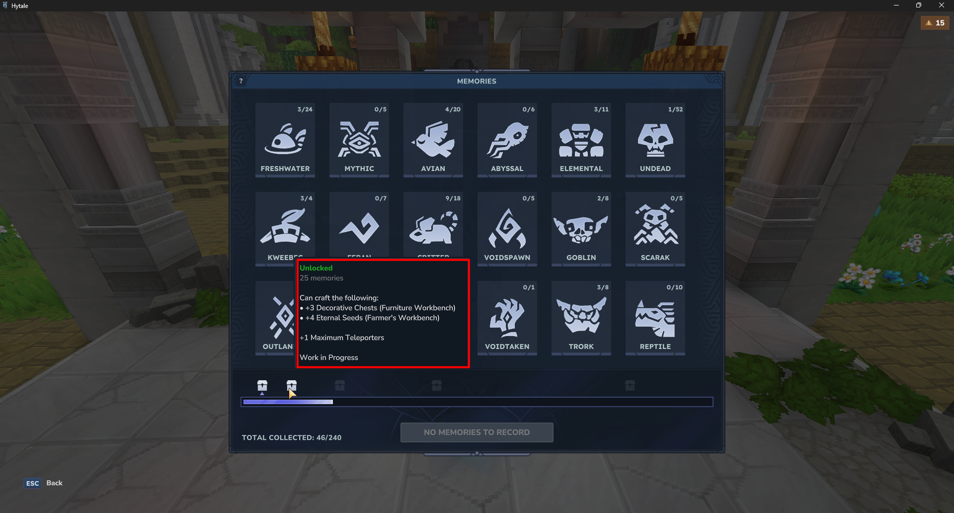 Submitting Memories gives you milestone rewards that tie into buildables, teleporters, farming, and late-game structures.
