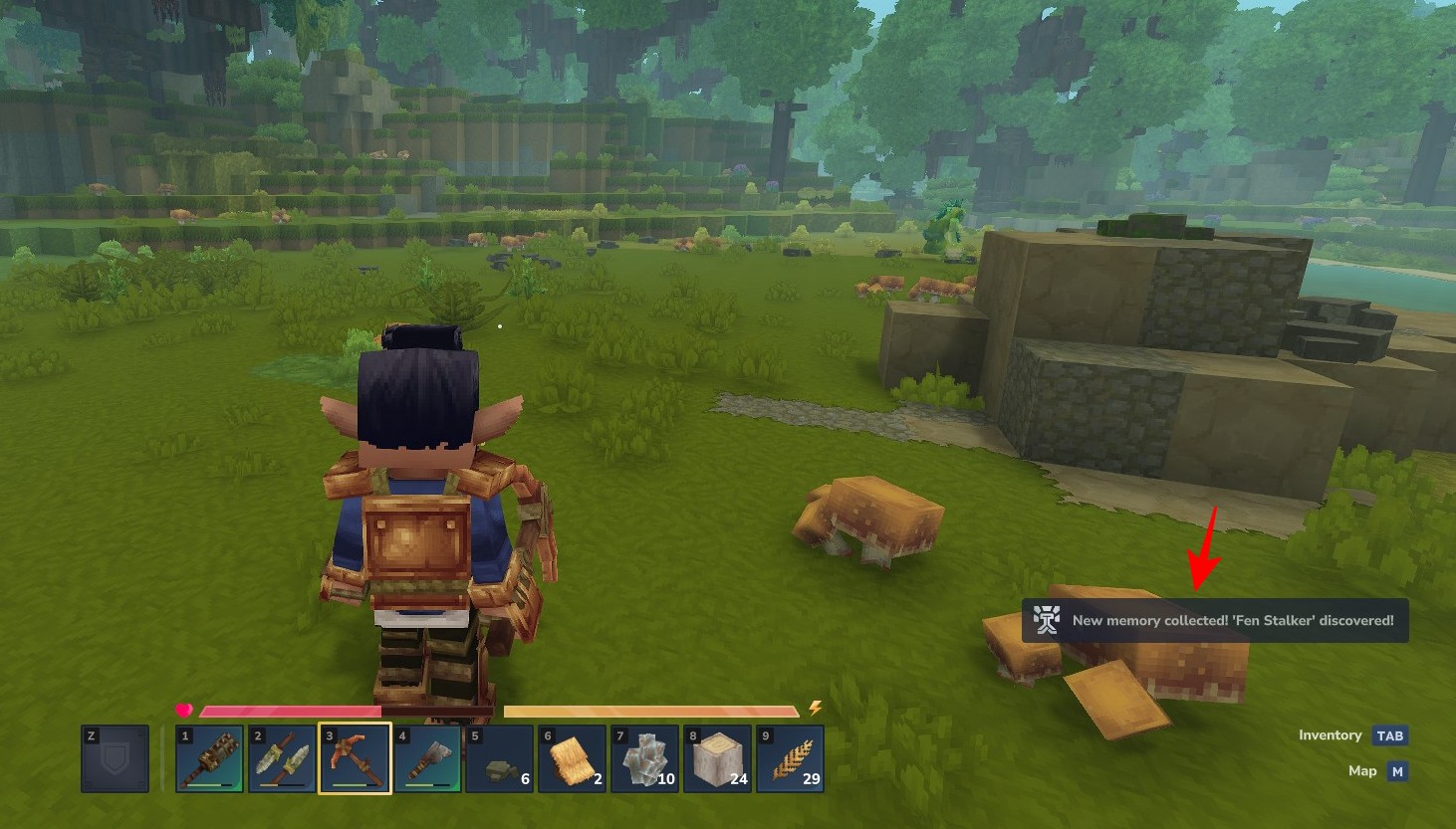 Explore the overworld normally—villages, forests, caves—and deliberately move close enough to new mobs to trigger the “discovered” notification so each one is logged as a Memory.