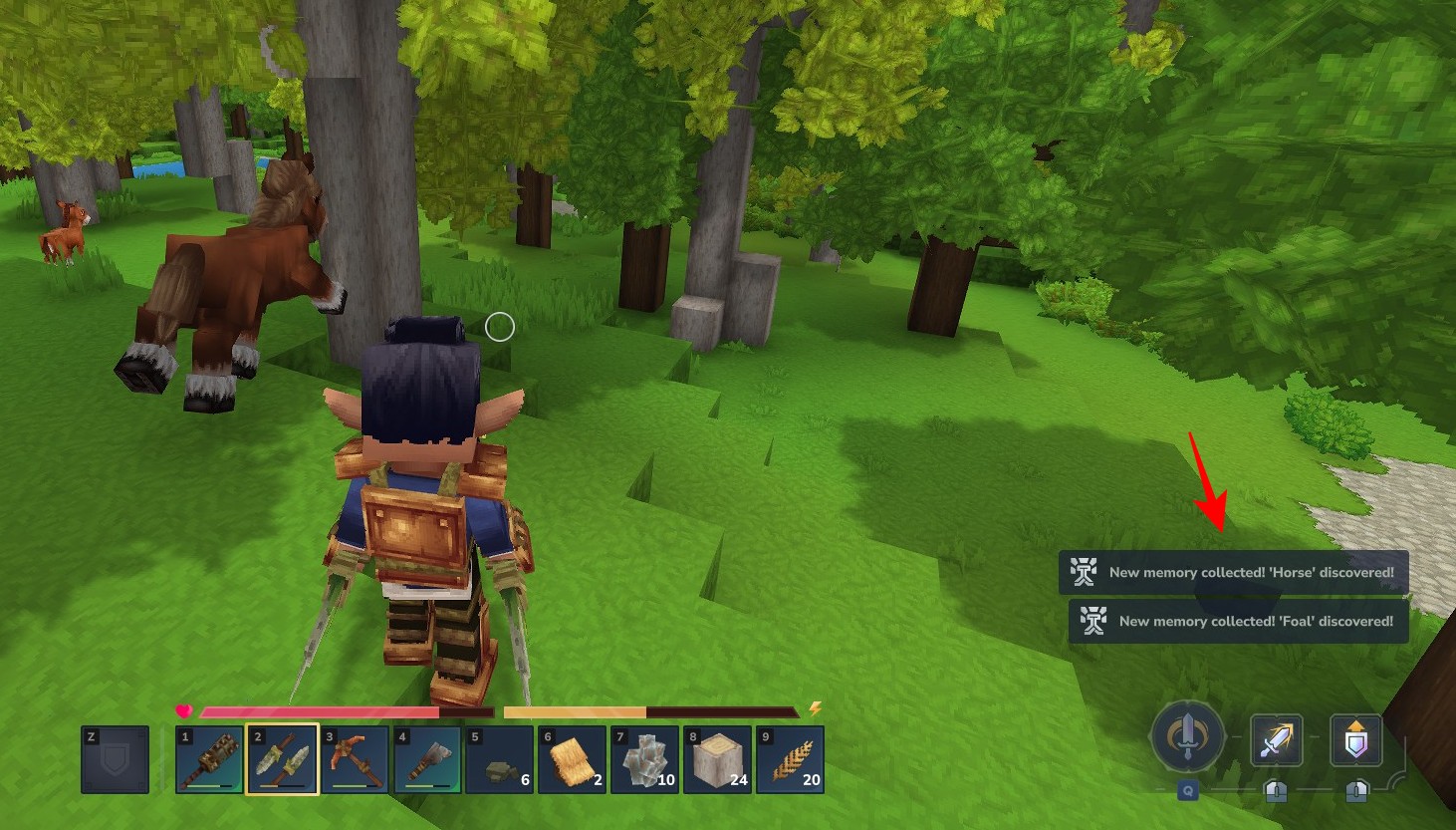 Explore the overworld normally—villages, forests, caves—and deliberately move close enough to new mobs to trigger the “discovered” notification so each one is logged as a Memory.