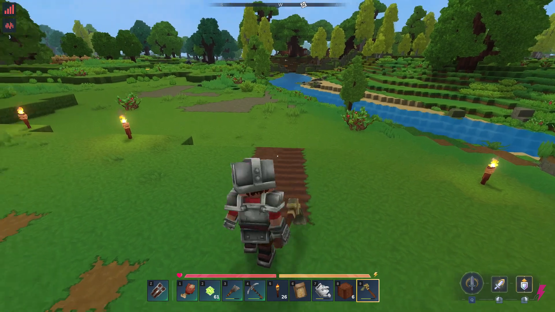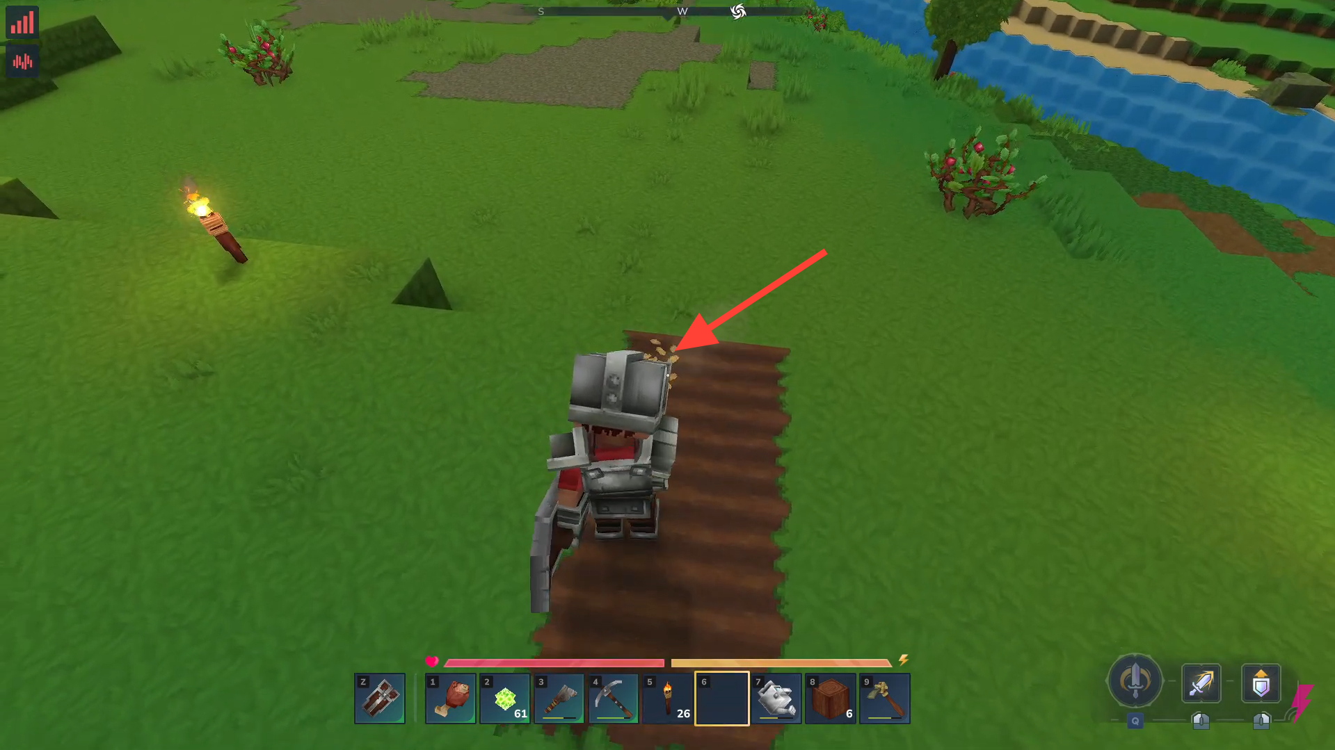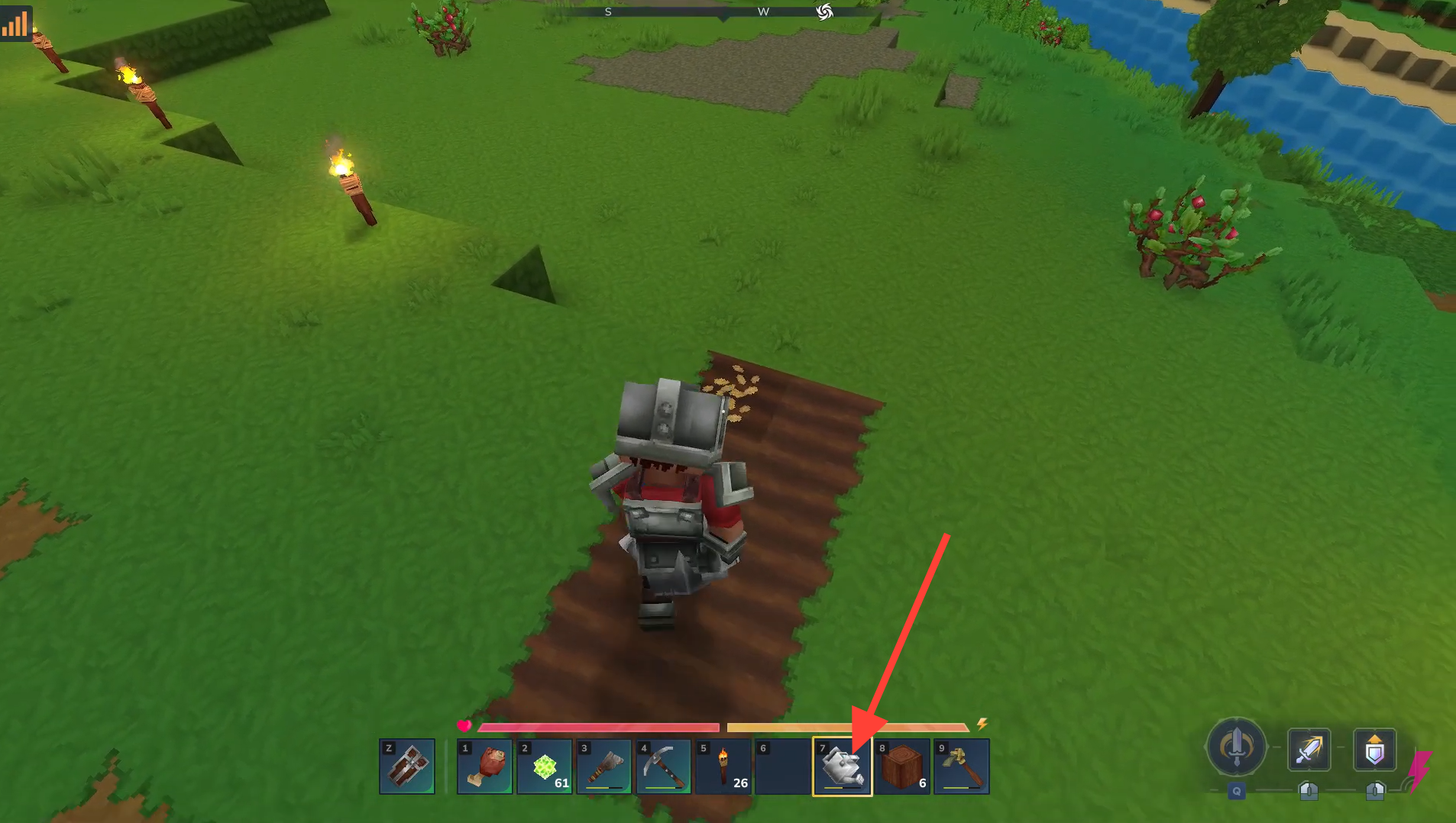 Equip a Hoe (crafted at the Farmer’s Workbench from Tree Trunks and Stone) and right‑click on dirt blocks to till them into farmland. Make a small patch of tilled soil near a water source.