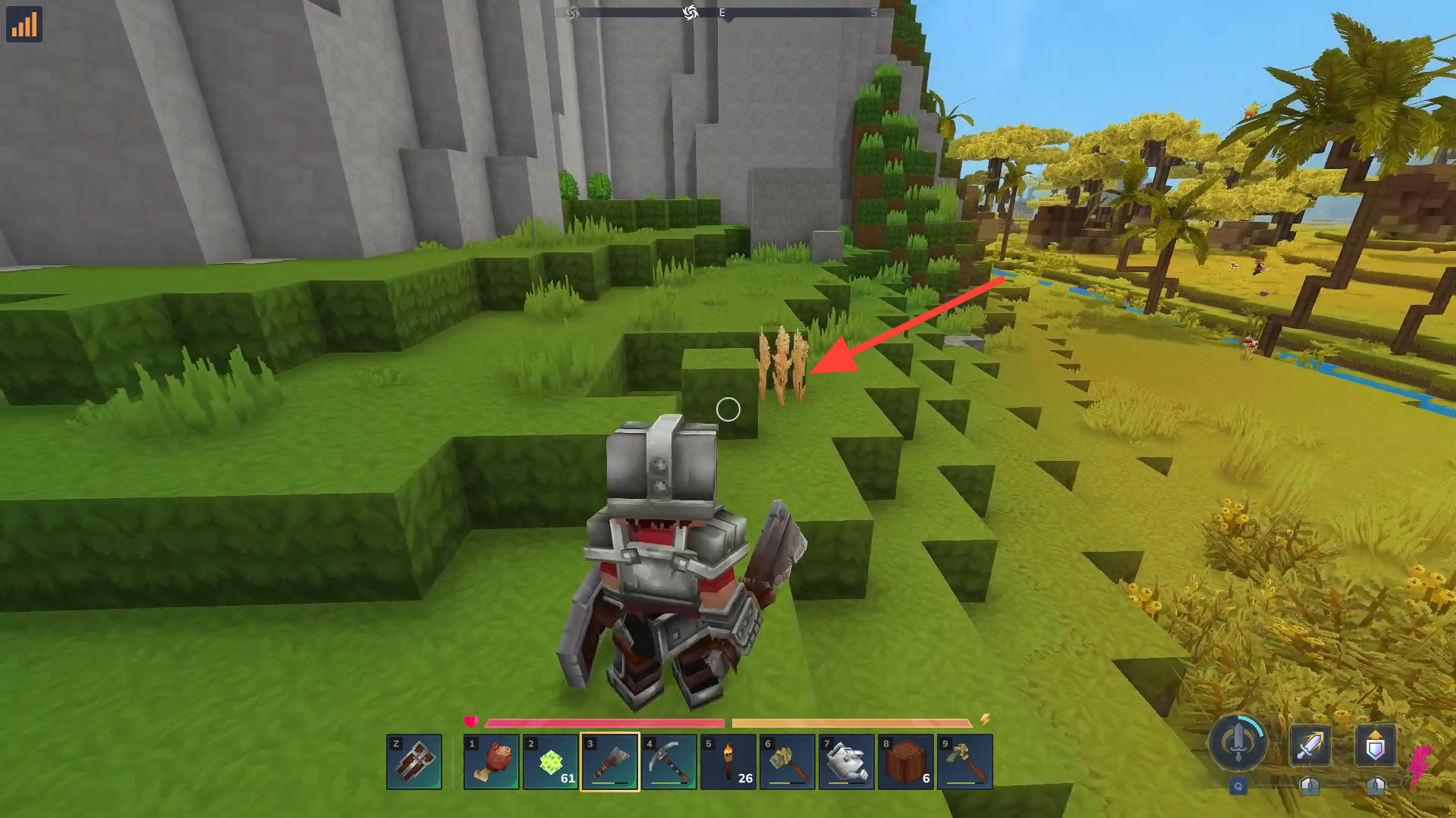 Wheat grows naturally in the overworld as tall, green, grassy plants in open, grassy biomes (like plains or meadows). It looks like a cluster of tall blades and is usually found scattered across the ground, not in dense fields. Simply walk around your starting area or nearby grassy zones and look for these patches; they are fairly common in early-game zones.