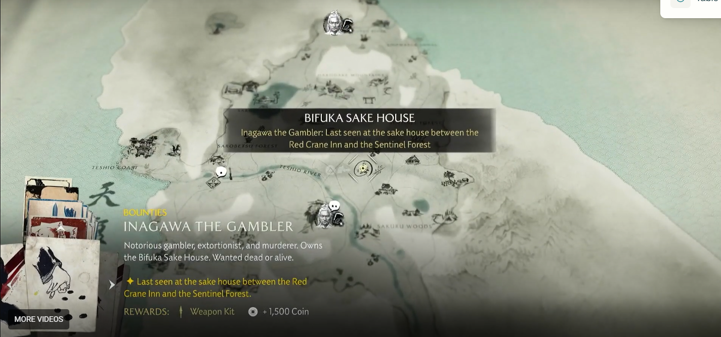 Inagawa the Gambler is a complex bounty target in Ghost of Yōtei, the 2025 sequel to Ghost of Tsushima. Found in the Bifuka Sake House, northwest of the Teshio River in Teshio Ridge, he's known not only for criminal activities but also for his deceptive game skills.