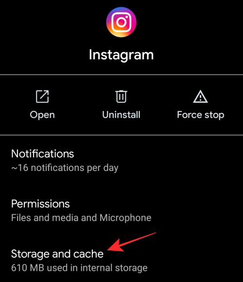 You will now be taken to the App info screen of Instagram. Here, select the ‘Storage and cache’ option.