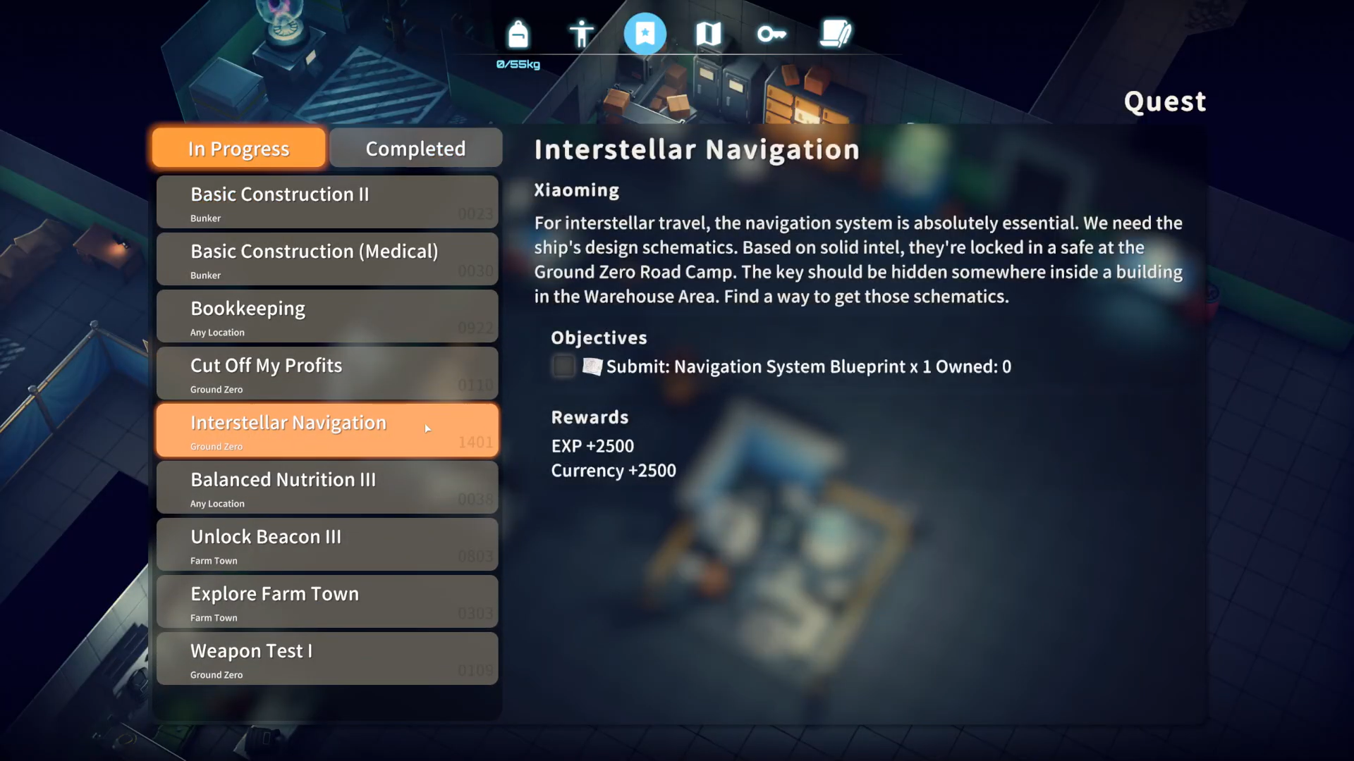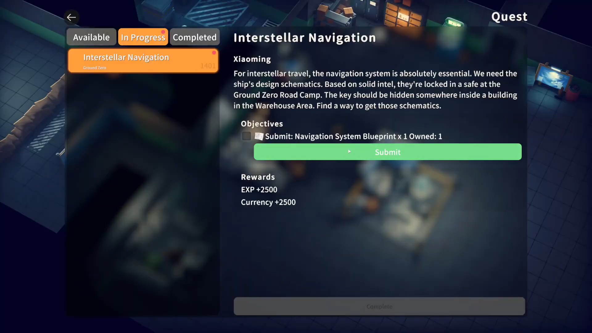 The Interstellar Navigation quest tasks you with submitting a Navigation System Blueprint to Xiaoming in the bunker. Completing it unlocks rewards like XP and currency.