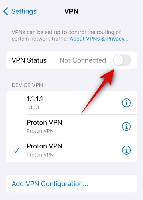 If turning off your VPN did not fix your issue, then it’s time for drastic measures. We now recommend you delete the installed VPN profiles on your iPhone (all of them) and see if that fixes the issue for you. If your Wi-Fi status icon has been absent due to issues caused by your VPN profiles, removing all of them should help fix this issue. To delete a VPN profile, head to Settings > VPN > Tap