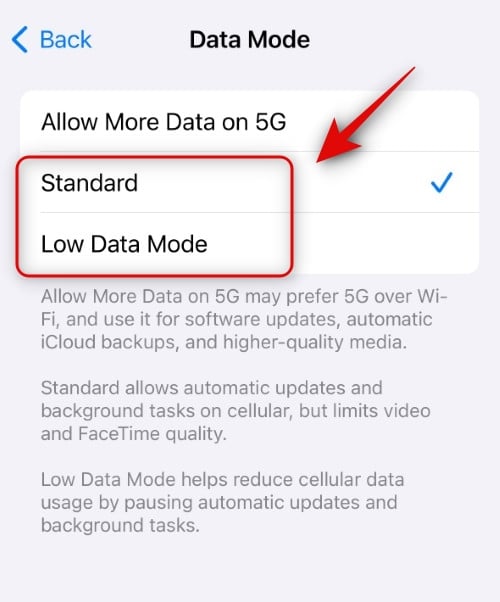 As discussed above, if your Wi-Fi network is inadequate or insecure, your iPhone will opt to use the cellular network instead of connecting to the internet. This is also true if your Wi-Fi network is slower than your cellular network, especially if you’re on a 5G network. Thus, we recommend you disable 5G on your iPhone, but first start by disabling Allow more data on 5G. This option tends to push your iPhone to use 5G whenever your Wi-Fi network is inadequate. To disable this option, head to Settings > Cellular > Cellular Data Options > Data Mode > Select ‘Standard’ or ‘Low Data Mode’. Once you do so, you can try using your Wi-Fi network again. If your iPhone uses 5G, it should now use your Wi-Fi network instead, which should help restore the Wi-Fi icon in your status bar.