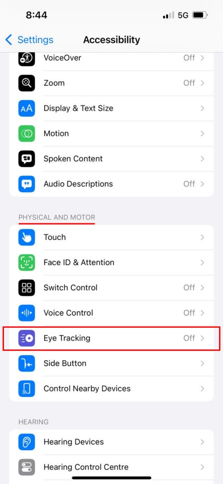 2. Under ‘Physical and Motor’, select Eye Tracking. Then toggle on Eye Tracking.