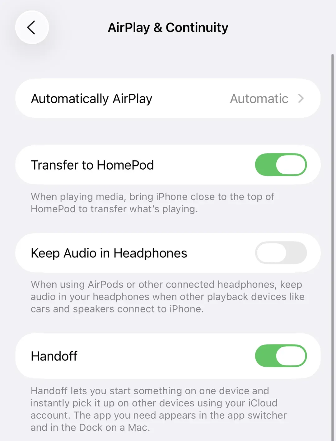 Located in Settings > AirPlay & Continuity, this new toggle ensures that when you're using AirPods or any connected headphones, your iPhone won’t reroute audio to nearby AirPlay-enabled speakers or your car.