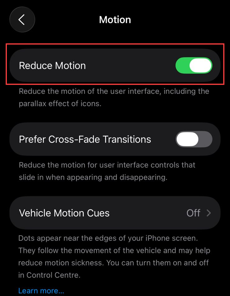 - Settings → Accessibility → Motion → turn on Reduce Motion